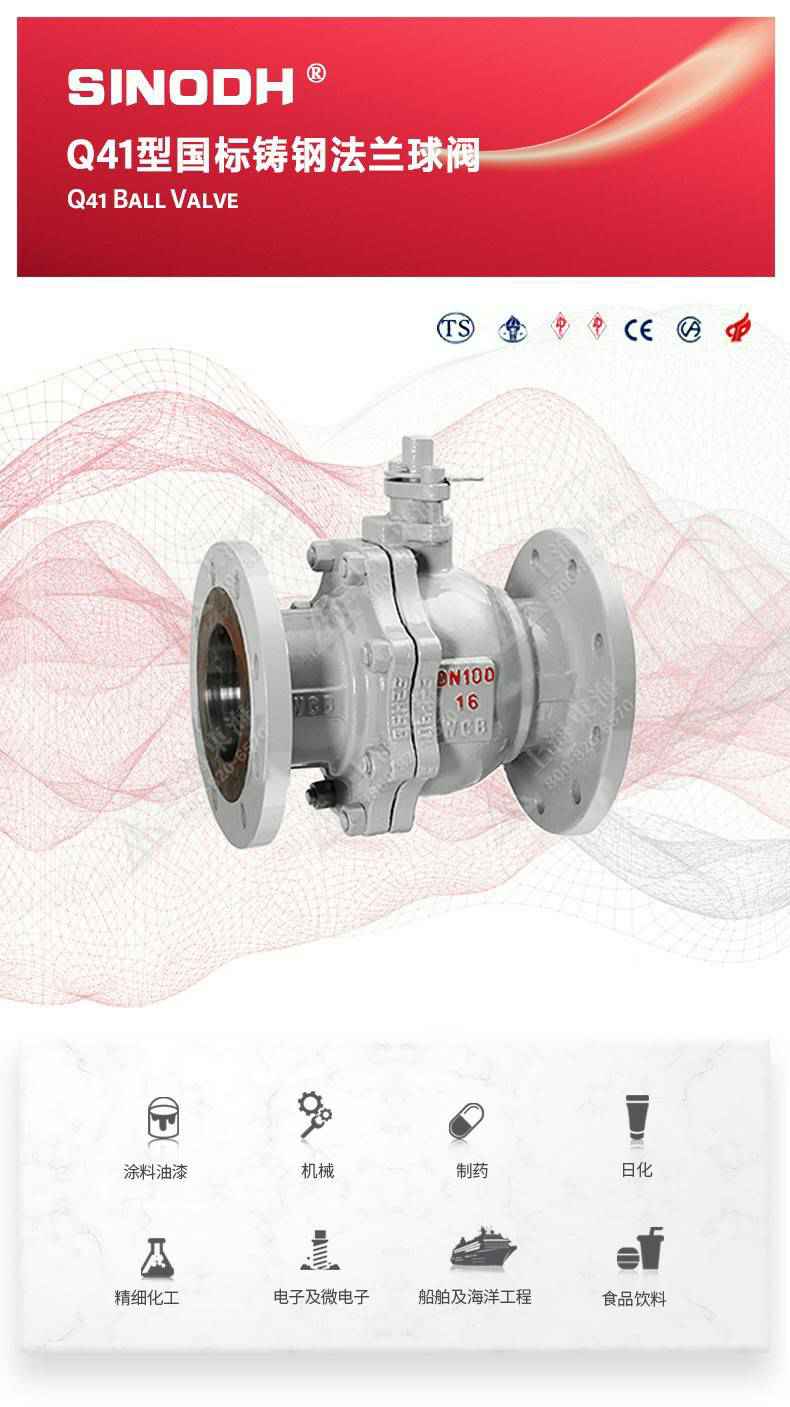 Q41型国标铸钢法兰球阀,为熊猫·体育-熊猫online(中国)自主研发生产。本产品设计制造标准符合GB/T12237、GB/T12224标准。该产品的球体在介质压力作用下球体能产生一定的位移并紧压在出口端的密封面上,保证出口端密封。适用于水、溶剂、酸和天然气等一般工业介质也适用于工况恶劣的介质,如氧气、过氧化氢、甲烷和乙烯等介质。